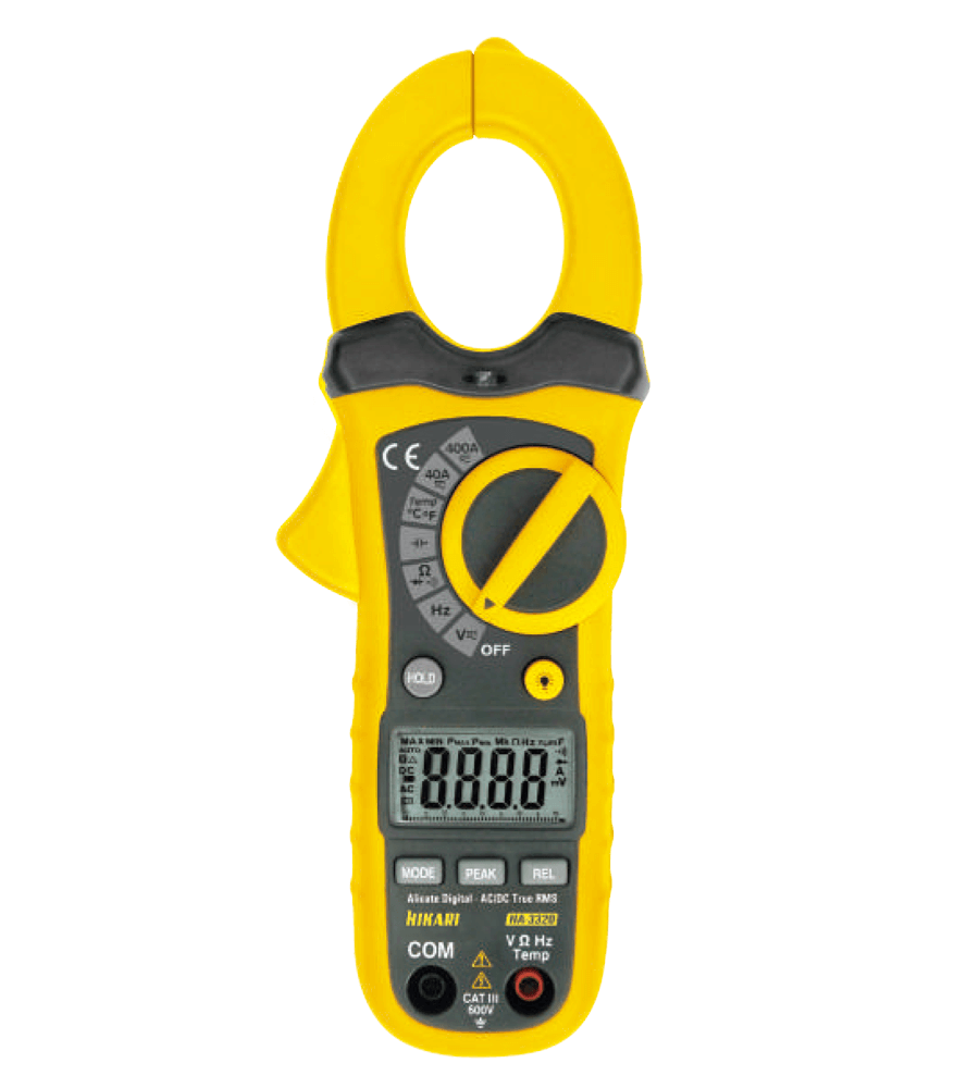 Instrumento digital portátil TRUE RMS com mudança de faixa automático, de acordo com a categoria III 600V de segurança, LCD de 3 ¾ dígitos com iluminação e barra gráfica, congelamento de leitura, modo relativo e desligamento automático. Realiza medidas de tensão DC e AC, corrente DC e AC, resistência, freqüência, capacitância, temperatura e testes de diodo, continuidade e NCV (teste de linha viva sem contato).