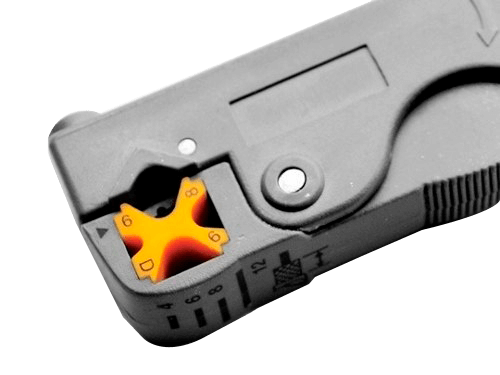 Decapador ajustável para cabos coaxiais. Descasca cabos coaxiais com eficiência e sem danificar a malha ou o condutor.