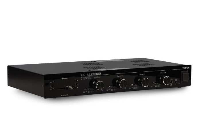 O amplificador Slim 4500 APP multi-channel possui 480 Watts RMS de potência (4 canais de 120 W RMS) e é ideal para grandes ambientes. Possibilita comando de funções via aplicativo Frahm. Possui conexão USB, SD Card, auxiliar (RCA), Entrada de Microfone balanceado com função “Volume Inteligente” (Baixa a trilha sonora automaticamente quando usado), função gongo (emite sinal sonoro para chamar atenção para uma comunicação), Rádio FM, Bluetooth e entrada de áudio do tipo OPTICAL (para conexão de alta fidelidade sonora dos Televisores atuais).