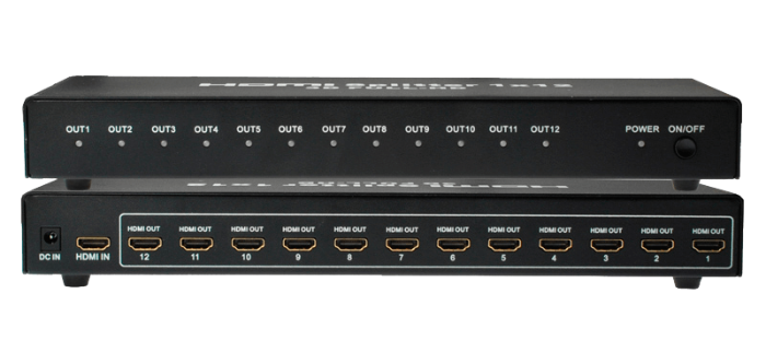 Distribuidor HDMI, distribui 1 sinal de HDMI para 12 monitores HDMI simultaneamente.Compativel com 3D e podendo ser utilizado em diversos lugares, como shoppings, supermercados, lojas de televisores assim ampliando a quantidades de saidas para uma mesma imagem, conectados a PROJETORES, DVDs, SBT e Video conferência.