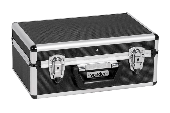 Produzida em alumínio com cantos plásticos e laterais reforçadas com cantoneiras de alumínio, conferindo maior durabilidade. Possui fechaduras e dobradiças metálicas com acabamento cromado e revestimento interno com material sintético macio (EVA). Conta com porta-ferramentas removível com 8 divisões.