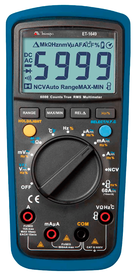 Diferencia-se por ser pequeno, portátil, True RMS, auto range e possuir display de 3 5 / 6 dígitos com uma estrutura original, altamente confiável e segura, assim como um display grande. O instrumento pode ser usado em medidas de tensão AC/DC, corrente AC/DC, tensão com frequência variável (VFC), resistência, diodo, continuidade, capacitância, temperatura, frequência e NCV (tensão AC sem contato). É o instrumento portátil ideal para manutenção. Destaca-se pelo baixo custo para um modelo de aplicação em ambiente industrial de categoria III 600V, com medições True RMS, teste de tensão sem contato (NCV), e temperatura.