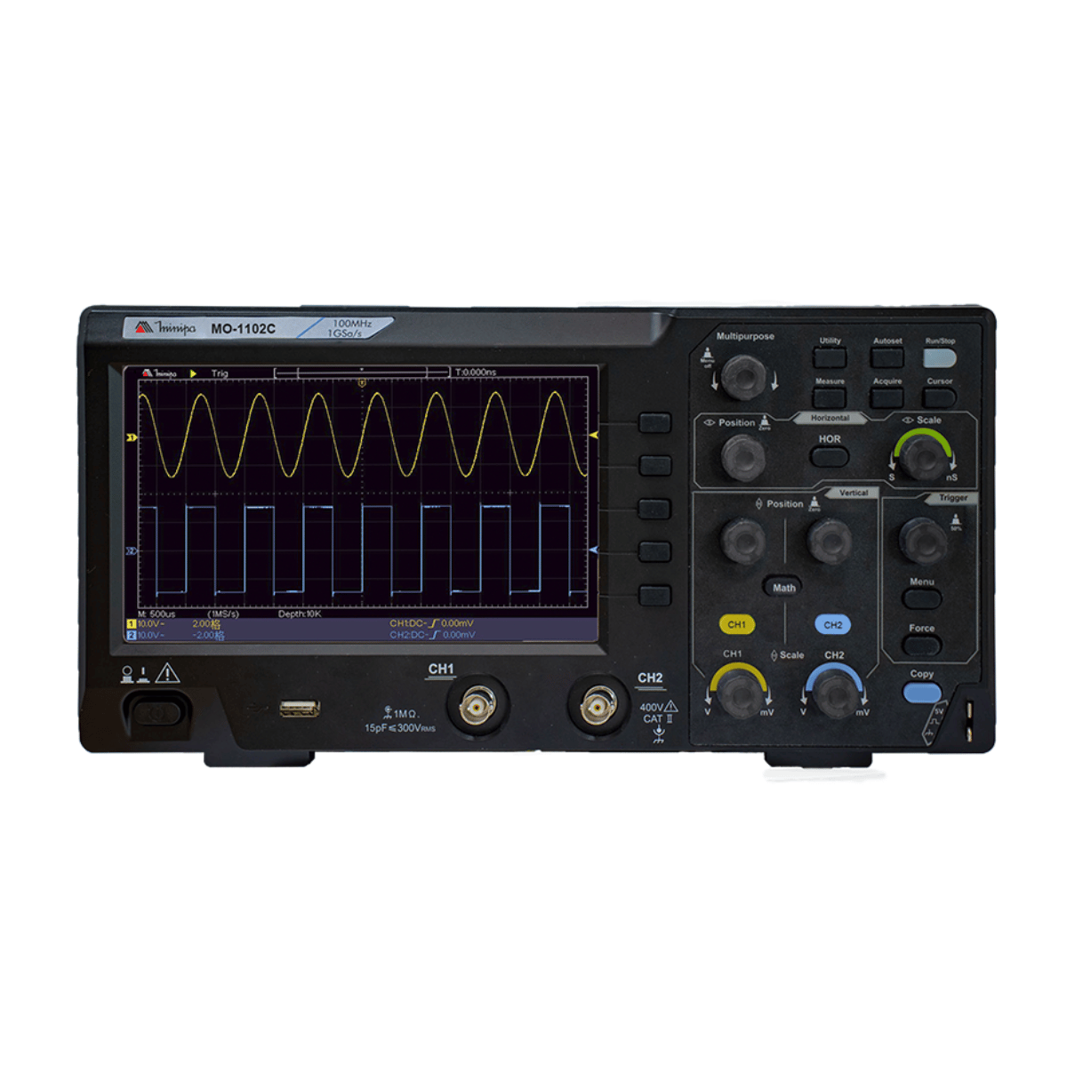 O osciloscópio MO-1102C possui um display LCD colorido de 7", banda de frequência de 100MHz e amostragem em tempo real de até 1 GS/s. Com 2 canais de entrada, base de tempo de 2ns a 1000s por divisão e diversas funcionalidades avançadas, como análise FFT, funções matemáticas e medidas automáticas, é ideal para aplicações de teste e medição em eletrônica, telecomunicações, automotiva, entre outras áreas. Compacto e completo, o MO-1102C oferece precisão, versatilidade e facilidade de uso em um único equipamento.