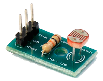 Esse módulo contempla um Sensor de Luminosidade LDR (do inglês Light Dependent Resistor ou em português Resistor Variável Conforme Incidência de Luz), que é um componente eletrônico passivo, cuja resistência varia conforme a intensidade da luz que incide sobre ele. Tipicamente, à medida que a intensidade da luz aumenta, a sua resistência diminui. O LDR é frequentemente utilizado em fotocélulas que controlam o acionamento da iluminação dos postes públicos e luzes em residencias. Tambem é utilizado em sensores foto-eletricos assim como foto-diodos.